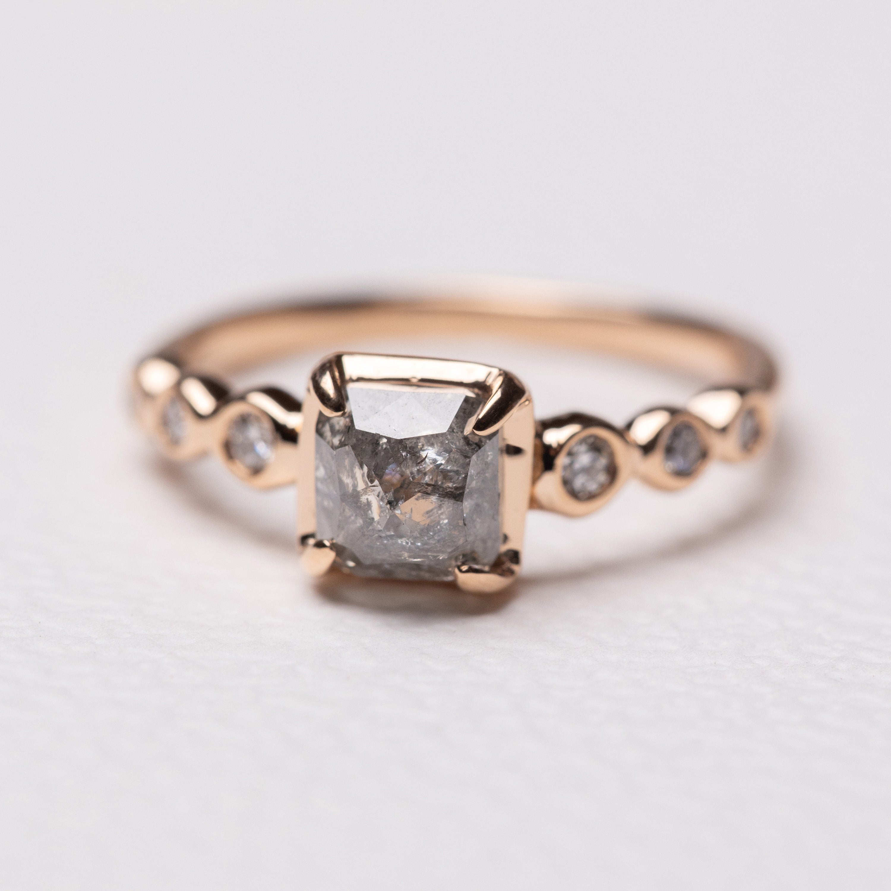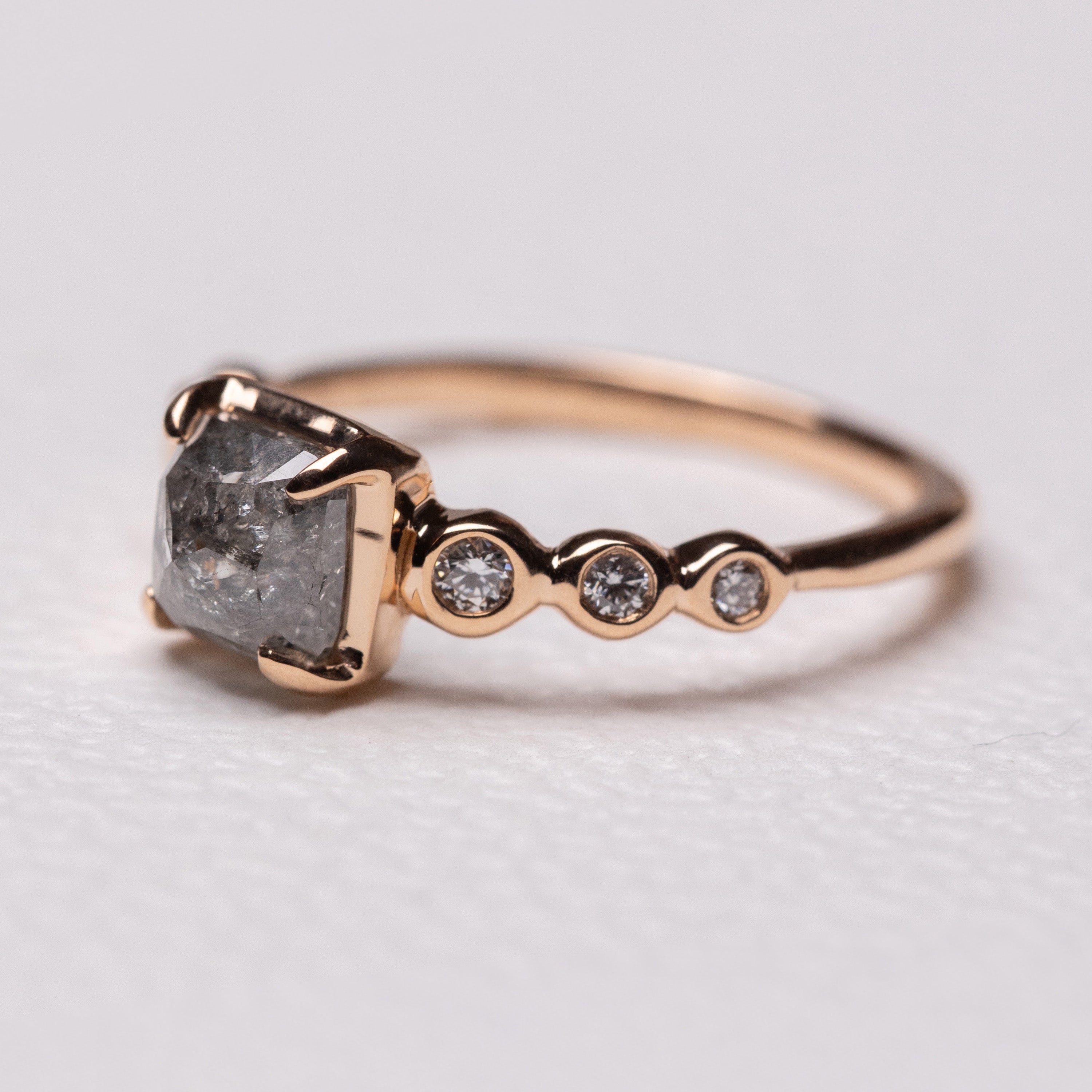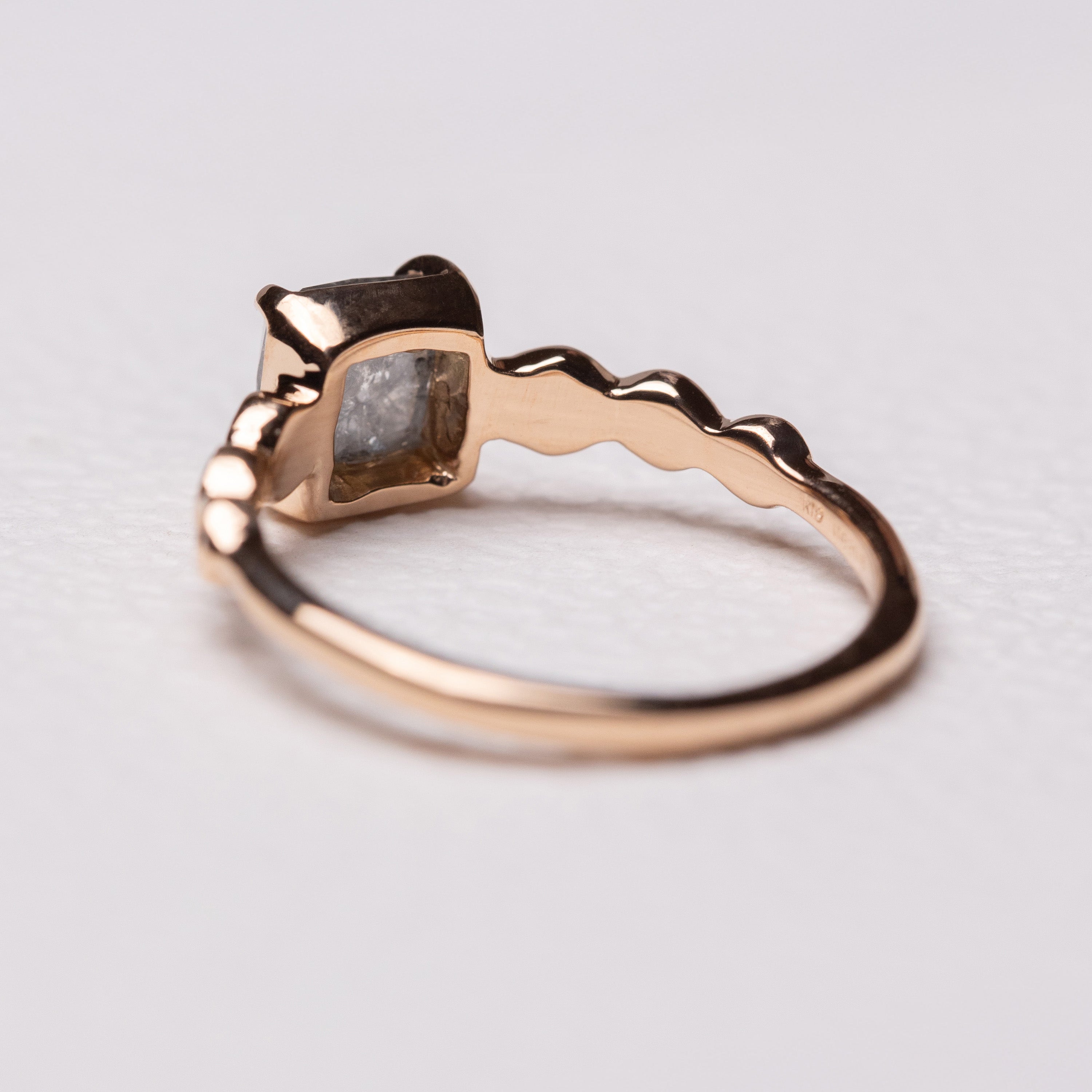 ピンクゴールドのあたたかさと、黒いソルトアンドペッパーダイヤの凛とした表情を組み合わせたリングです。