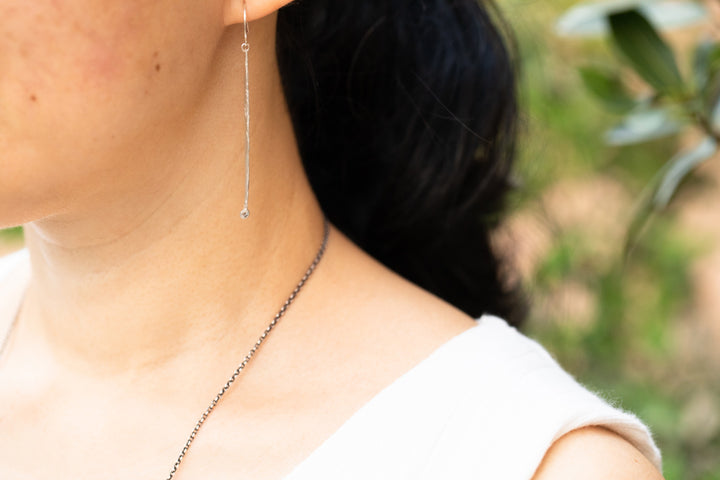 表面の質感に少しハンドメイド感を加えた細い棒状のピアス。下にさがった先にダイヤを留めて、お顔周りにスマートなアクセントが欲しい時のためにデザインされました。ゆらゆらと揺れながら、着け心地もよいのは、この「細さ」からくるもの。それでも、強度を保ち、ふとした時のシルバーをマットな加工にした明るい色がわかるよう、横から見ると2㎜の幅があります。ごくシンプルに見えますが、「何か足りない時」にこだわりの「ひと癖」を表現してくれるアイテム。他にジュエリーを何もつけなくても、「おしゃれな人」にしてくれます。