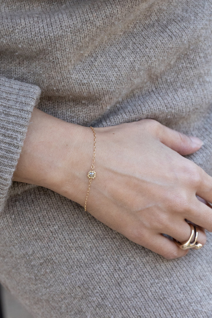 トープ色のナチュラルダイヤモンドの両面をローズカットにしてブレスレットにセッティング。表裏がないので、くるくる回っていつもきらきらと光ります。肌に馴染むカラーのナチュラルダイヤモンドですが、ダイヤの輝きはやはり特別。時々ブルーやピンクにも見える、とても美しいカラーです。チェーンは隙間のあるものを。見ためも軽やかです。写真のように、星屑のブレスレットと重ねると輝きがプレスされて一段華やかに。グラスを手に取るシーンで、手元を美しく彩ります。